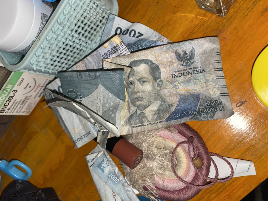 The image depicts an assortment of objects scattered on a polished wooden surface, likely a table, in an indoor setting in Unknown, Unknown. Multiple crumpled Indonesian Rupiah banknotes are visible, including several 2000 Rupiah notes featuring Mohammad Hoesni Thamrin and partially visible 10000 Rupiah notes. A reddish-brown cylindrical tube, resembling a lipstick, rests on a decorative item made of braided and looped yarn in shades of pink, beige, and maroon, accented with a small wooden bead. In the upper right quadrant, a light blue plastic woven basket contains a white, opaque jar or container with a lid, bearing faint text indicating ingredients such as "NIACINAMIDE" and "DIMETHICONE." Behind the cluster of banknotes, a white cardboard box for "MONOLON BNC26L-3" surgical sutures (3-0 Blue Monofilament Suture, 75CM) is partially visible. A bright blue plastic object, consistent with scissor handles, is positioned in the upper left corner. A portion of a yellow plastic lid and a reflective object are visible in the lower right quadrant. The scene is illuminated by warm, artificial light. No individuals are present.