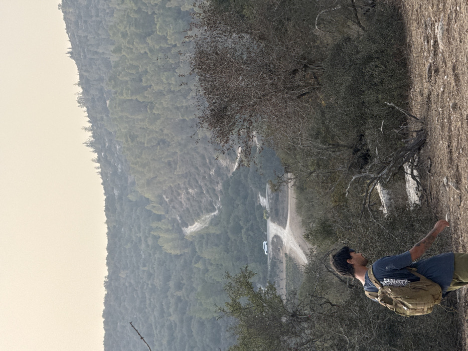 A single male individual is depicted in the foreground, positioned on a dry, rocky slope characteristic of the Mate Yehuda Regional Council, Israel. He is facing towards the right side of the frame, with his head slightly bowed, looking downwards. He wears a dark blue t-shirt featuring a white design on the back, olive-green shorts, and a tan tactical-style backpack. A tattoo is visible on his left forearm. The immediate foreground consists of sparse, dry vegetation and exposed soil. In the midground, a network of dirt roads traverses the hilly terrain, with a white SUV or crossover vehicle visible parked on a horizontal section of the road. Further into the background, undulating hills covered in dense, predominantly evergreen forest extend towards a hazy, light-colored horizon. Some deciduous trees with bare branches are scattered throughout the midground and foreground. The overall scene suggests a dry, outdoor environment under diffused light.