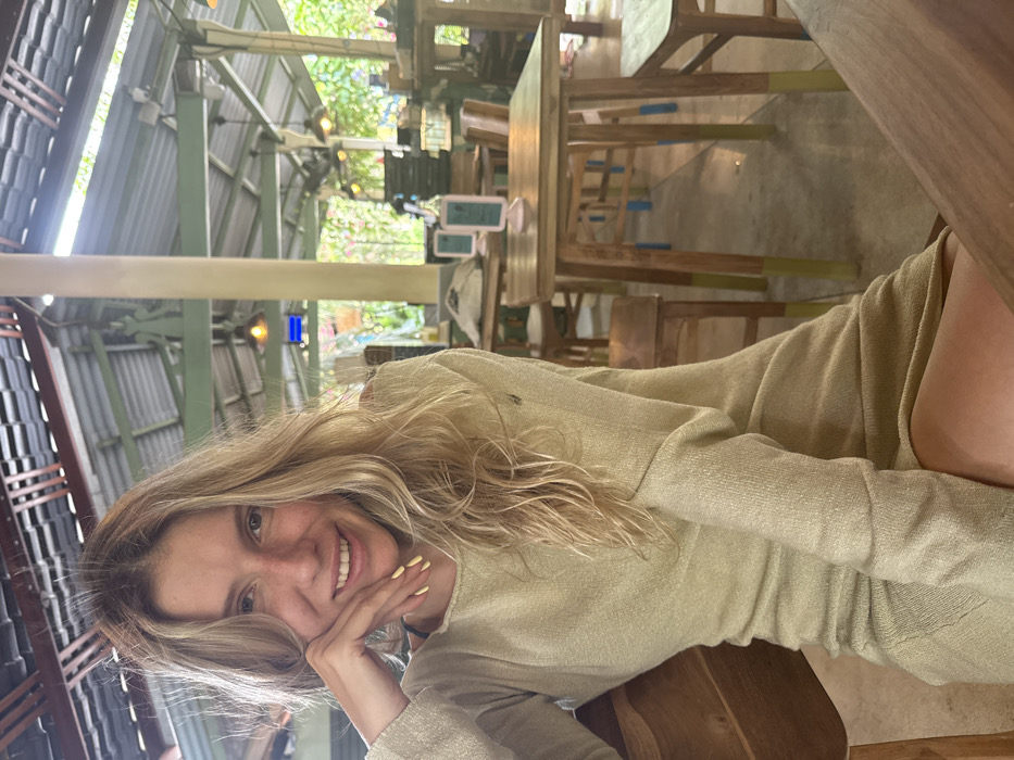 A blonde woman in a long-sleeved beige dress smiles, resting her head on her hand. She's seated at a wooden table, with more tables and chairs visible in the background. The setting appears to be an open-air restaurant or café, indicated by the visible roof structure and glimpses of greenery outside. Light streams in, illuminating her face and hair. The overall image has a warm and casual feel.