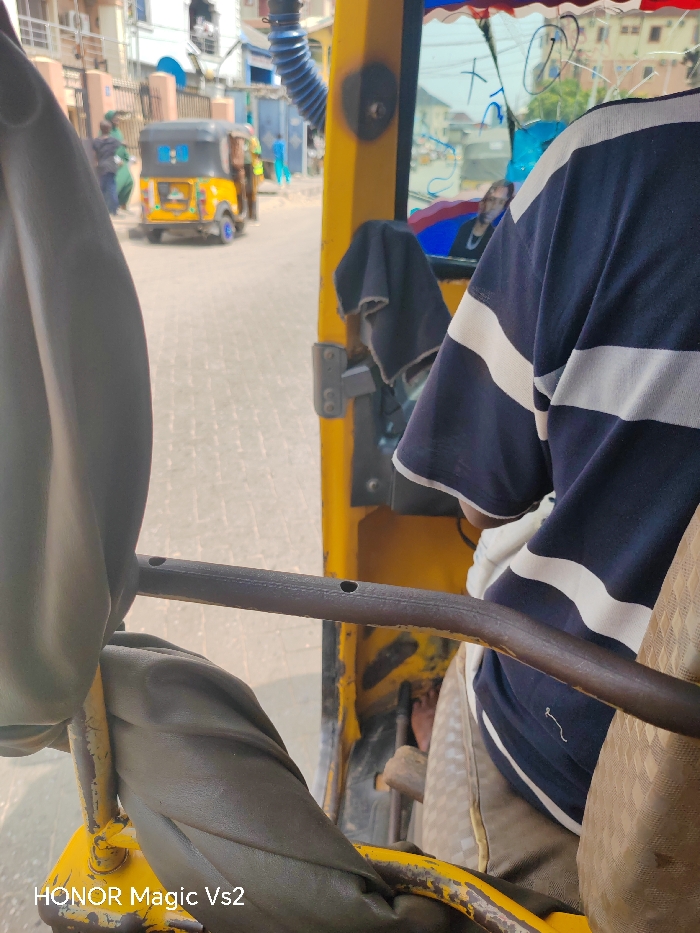 - "From within a yellow auto-rickshaw, a partial view of a passenger wearing a navy and white striped shirt is visible" by FM-NPexB3, licensed under CC BY 4.0