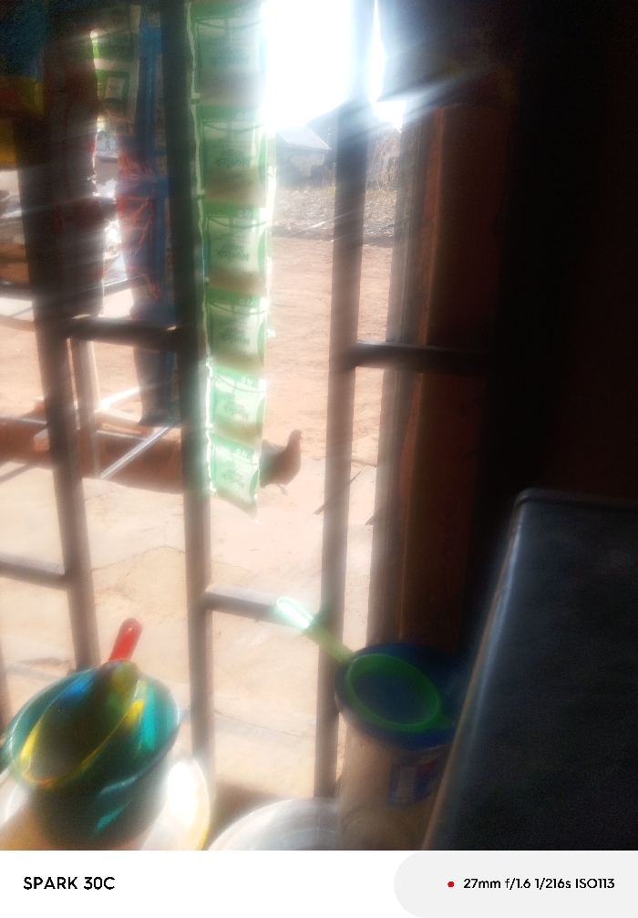 A blurry, sun-drenched image showcases a window with a metal frame, partially obscured by hanging green and white packages. Outside, a dirt ground is visible, with a hen standing on it. Inside, a colorful basin sits on a surface, and a bucket is also visible near the window. The right side of the frame reveals a dark object.