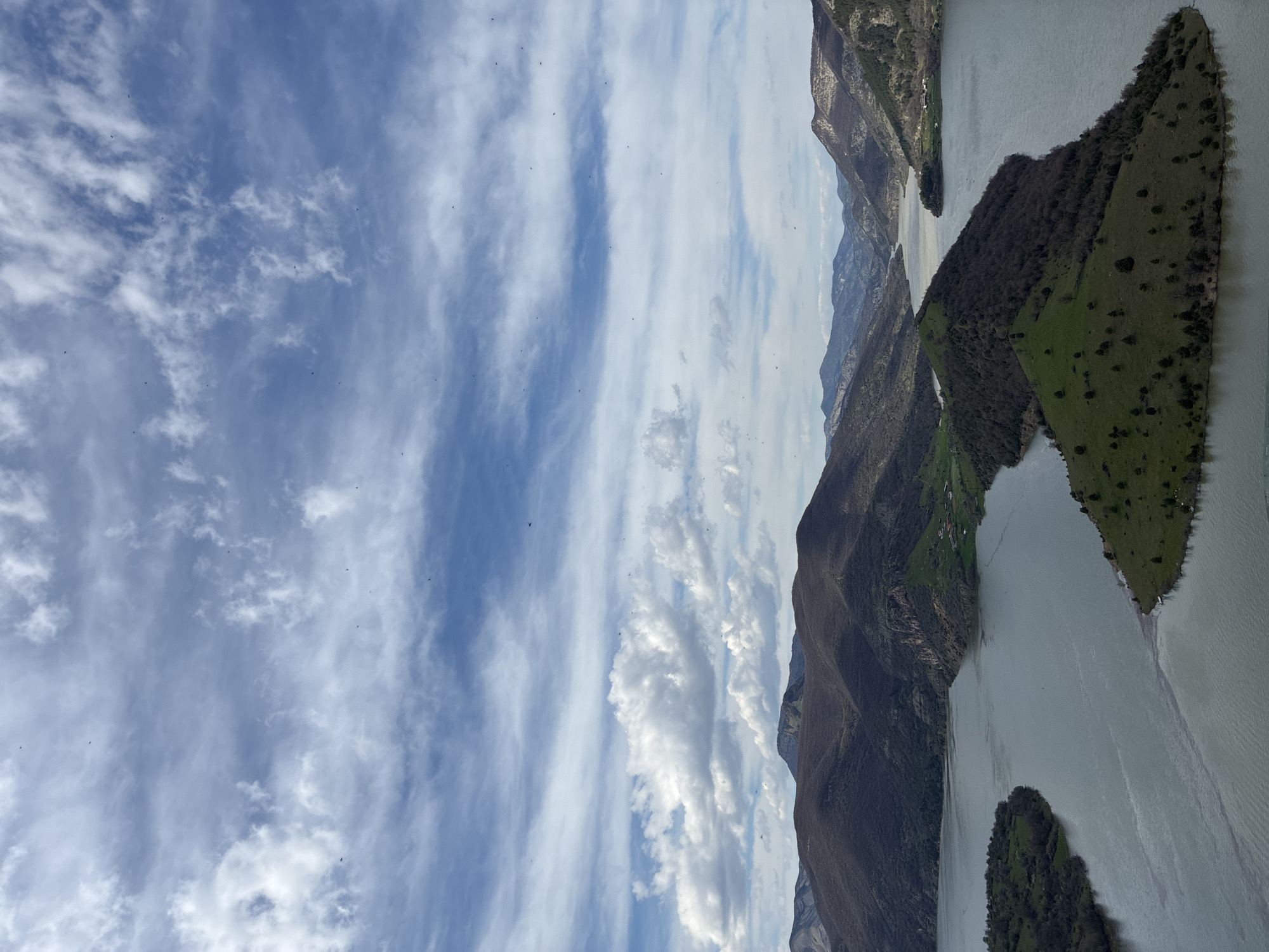 The image displays a landscape scene taken at the Borovitsa Reservoir in Bulgaria. The reservoir is filled with water that appears grayish in color and has several green landmasses or peninsulas extending into it. Hills and mountains surround the water, and their slopes show a mix of greenery and rocky or barren surfaces. Above the landscape, a blue sky is filled with scattered clouds.