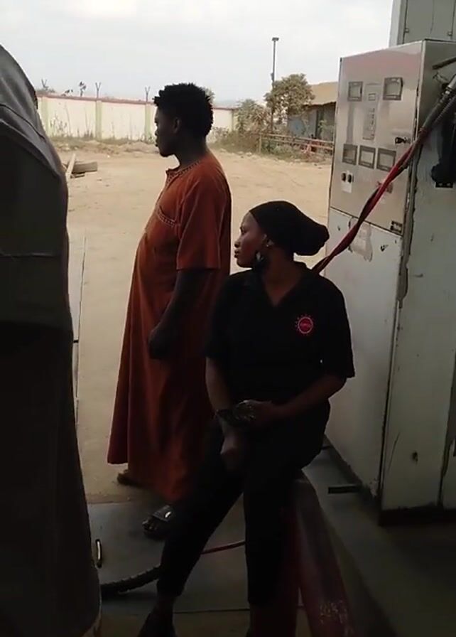 CNG (Compressed Natural Gas) station. There are two men and one woman visible. One man in an orange robe stands next to the gas pump while the woman, wearing a black uniform with a red logo, sits on a red barrier nearby. The gas pump is stainless steel. A white truck with "CNG" written on it is parked at the pump. Behind a green pillar with a "Caution C.N.G. Area" sign is another man in a plaid shirt and dark pants. There is a small, wooden table nearby, cluttered with papers. The sky is overcast.