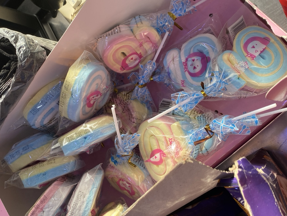 The scene is located in Kabala, Nigeria. The image displays an open, light pink cardboard box filled with individually packaged confectionery items, viewed from above. The box exhibits a torn edge in the foreground on the left side. The primary subjects are numerous lollipops and rectangular marshmallow-like sweets. Each lollipop consists of a white stick, is encased in clear plastic packaging, and secured with a blue and white patterned ribbon tied with a gold twist tie. The lollipop candy is large, spiral-shaped, showing concentric rings of pastel pink, yellow, blue, and white. Some lollipops feature a stylized character sticker centrally on the candy. Text such as "Romi" and "Rainbow Marsh" is discernible on some lollipop wrappers. The rectangular sweets are also individually sealed in clear plastic, revealing layered pastel colors. Visible production and expiration dates, for example, "PRO:05.01.2023 EXP:04.01.2024," are present on several packages. In the upper right background, a clear plastic bag contains dark, indeterminate objects. A crumpled, partially visible purple package is positioned in the lower left foreground. The environment appears to be an indoor retail or storage setting. No individuals or specific actions are visible.
