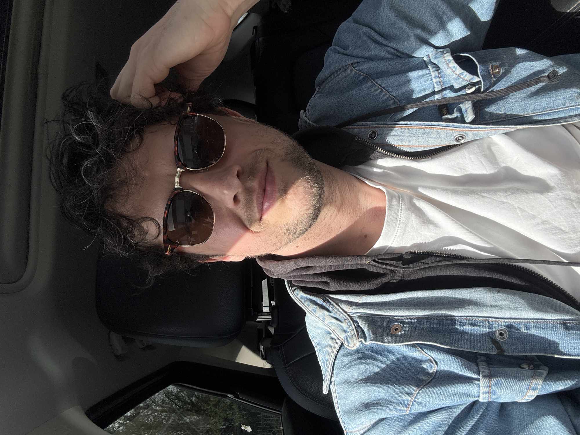 - "A Caucasian male with short, curly brown hair interspersed with gray strands, a light beard, and brown-tinted sunglasses is positioned at an angle within a vehicle, likely a car" by FM-pjP223, licensed under CC BY 4.0