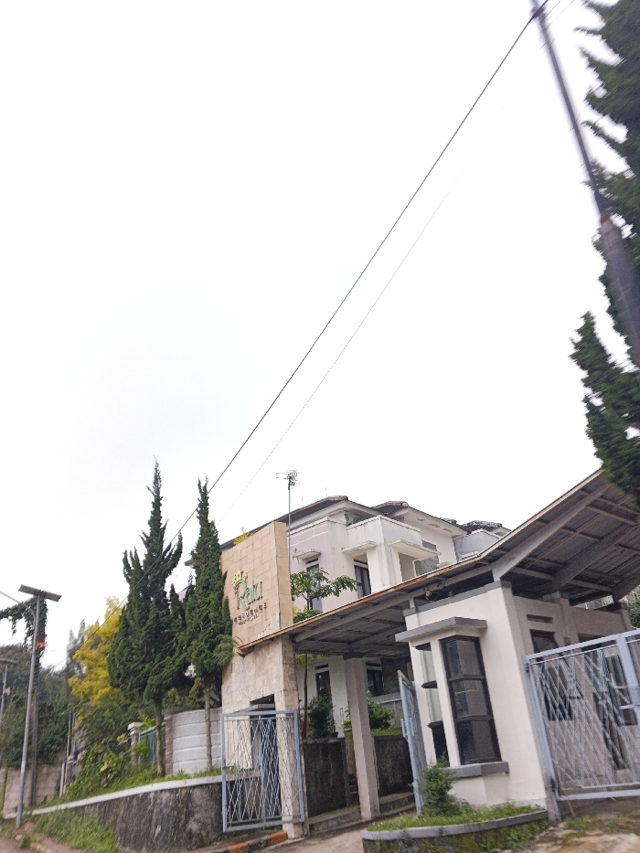 This image depicts a multi-story building complex identified by a prominent sign as "RAMA RESORT & HOTEL" located in Alta Floresta, Brazil. The scene is captured on an overcast day, with a uniformly bright white sky occupying the upper half of the frame. The central structure is a light-colored building, possibly white or off-white, with sections featuring stone cladding, particularly around the signage which also includes a crown emblem. An antenna is visible on the building's roofline. To the immediate right, a separate, smaller entrance structure with a sloped, corrugated metal roof extends over what appears to be an entry point, featuring dark-framed windows and open metal gates. The property is bordered by a concrete retaining wall topped with metal fencing. Lush vegetation, including several tall, conical evergreen trees and a large tree with yellow foliage, is present along the property's perimeter to the left. Utility infrastructure consists of a prominent diagonal power line crossing the sky, a vertical utility pole on the far right, and another utility pole with a light fixture on the far left. No individuals or vehicles are visible in the depicted environment.