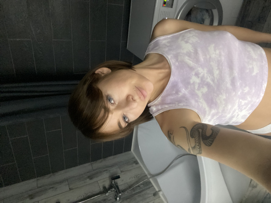 A medium close-up selfie captures an adult female in a residential bathroom. The subject has short, brown hair with bangs and blue eyes, maintaining direct eye contact with the camera. She is wearing a light purple and white tie-dye ribbed crop top, with white underwear visible at her waist. A prominent black coiled snake tattoo is visible on her upper left arm. The background features a white, angular bathtub with a chrome shower head and mixer tap attached to a wall tiled with light grey wood-look panels on the left side. To the right, a white front-loading washing machine displays illuminated indicators beneath a dark grey surface, set against a wall composed of dark grey rectangular tiles. A dark shower curtain is partially visible in the upper right. The specific location within Irkutsk, Russia, cannot be determined from the visual information provided.