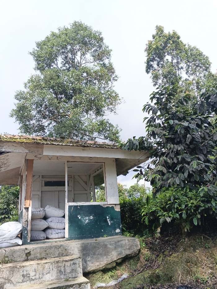 An outdoor scene in Nanlao, China, depicts a dilapidated single-story structure situated amidst dense vegetation under a bright, overcast sky. The structure features a light-colored, moss-covered roof and walls with peeling white and dark teal paint, revealing underlying material. A large, open rectangular entryway is visible on the front-facing side. Inside this opening, a stack of at least seven white sacks, possibly containing agricultural goods, is visible. Three weathered concrete steps lead up to the structure on its left side. To the right of the structure, the ground slopes downwards, covered with soil and green foliage, including several dark-leaved bushes resembling coffee plants. Two large, leafy green trees rise prominently behind and to the sides of the structure, with their canopies extending into the upper frame. Some discarded plastic debris is present on the sloped ground to the right of the steps. No individuals are present, and no active interactions or actions are depicted.