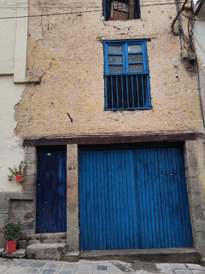 A two-story building with a weathered, yellow facade features blue wooden doors and a window. The lower level showcases a narrow entrance door beside a wider garage door. Above, a blue window with bars is centered, and a smaller, barred window is visible at the top. Patches of exposed stonework add texture, and a small pot of plants hangs near the entrance. The number "366" is visible on the wall near the smaller entrance.