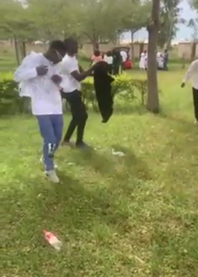group of people on a grassy lawn. A person in a white shirt and blue jeans dances in the foreground, while others, mostly in white shirts and dark pants, are behind them. Some are moving, while others appear to be watching. There's a red and white bottle lying on the grass near the bottom of the frame. In the background, there are trees, a hedge, and a building with a wall. The lighting indicates it's daytime.