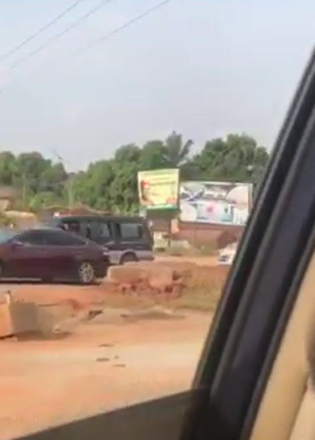 view from inside a car driving on a road in what appears to be a tropical or subtropical region. The road is mostly paved, but has patches of reddish-brown dirt and debris along the sides. In the background, there are various vehicles, including a white-and-red bus, a white sedan, a black pickup truck, and a silver hatchback. There are also billboards with advertisements, stacks of what appear to be construction materials, and lush green trees and palm trees dotting the landscape. Power lines stretch across the sky above the scene. The camera is looking out of the passenger side window. The overall impression is that the video was taken in a developing country.