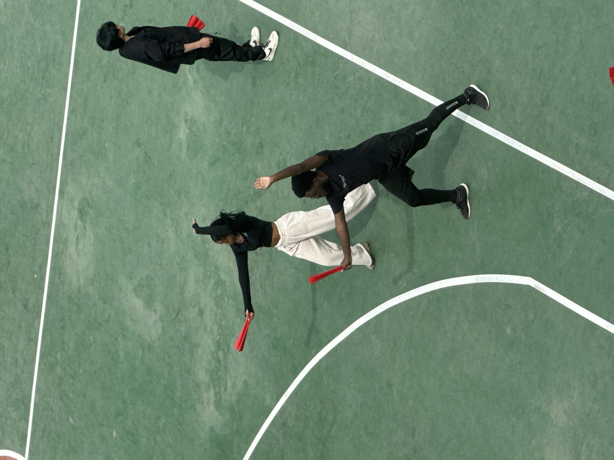 The scene takes place on a green court surface with white demarcation lines in Daxing District, China. Three individuals are present. In the left-center, a dark-skinned female with dark, wavy hair wears a black long-sleeved crop top and light-colored wide-leg pants. She stands in a dynamic pose with both arms extended, holding a single red cylindrical baton in each hand. To her right and slightly in the foreground, a dark-skinned male wearing glasses, a black short-sleeved t-shirt with a white logo, black shorts over black compression leggings, and black sneakers, mirrors a dynamic pose with his right arm raised and holds a single red cylindrical baton in his left hand. These two individuals appear engaged in a choreographed routine. In the upper-right background, a third individual with short dark hair, wearing a black jacket, black pants, and white sneakers with black swooshes, stands partially turned away, holding a cluster of red cylindrical batons in their left hand. The green court surface features a prominent white curved line in the foreground and a straight white line extending horizontally across the top section, with another vertical white line visible on the right side.