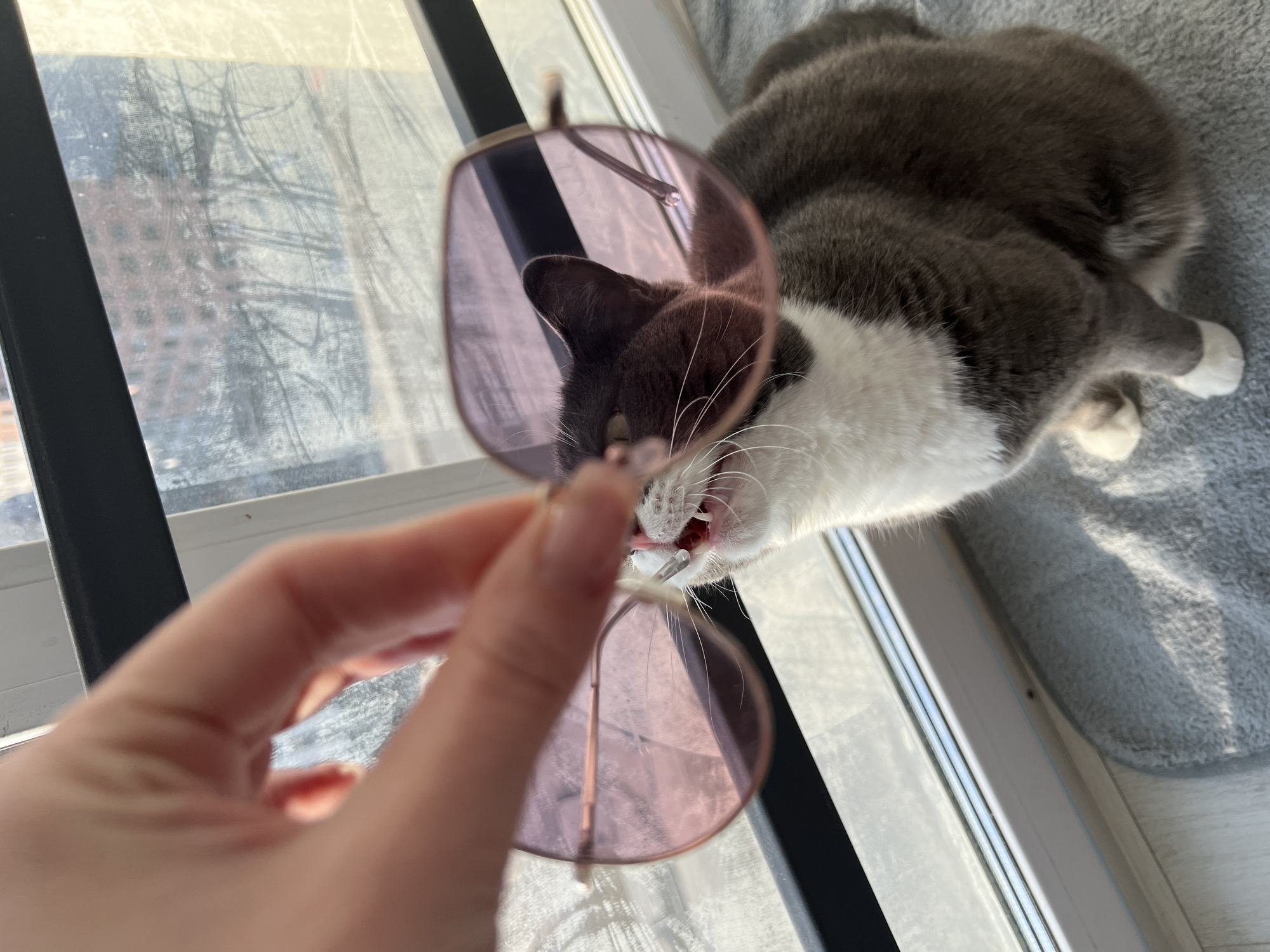 A person's hand holds a pair of rose-tinted sunglasses in front of a gray and white cat that is lying on a light gray, soft surface. The cat's mouth is slightly open, revealing teeth and a glimpse of its tongue. The background includes a window with a view of buildings, suggesting an urban setting. The location is presumed to be in Tyumen, Russia. The scene appears to be indoors near a window with natural light.
