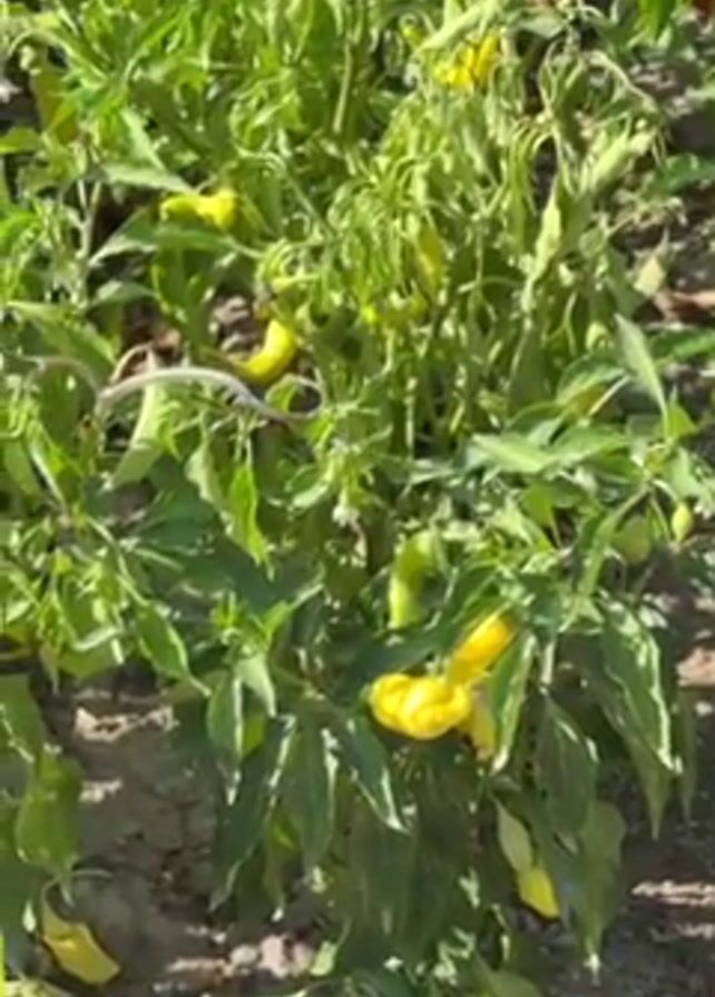 lush garden bed with multiple pepper plants. The plants are heavily laden with peppers in various stages of ripeness, ranging in color from yellow and green to red. The foliage is dense and green, obscuring the ground beneath the plants. The setting is outdoors, suggesting a sunny day. There is no audio.
