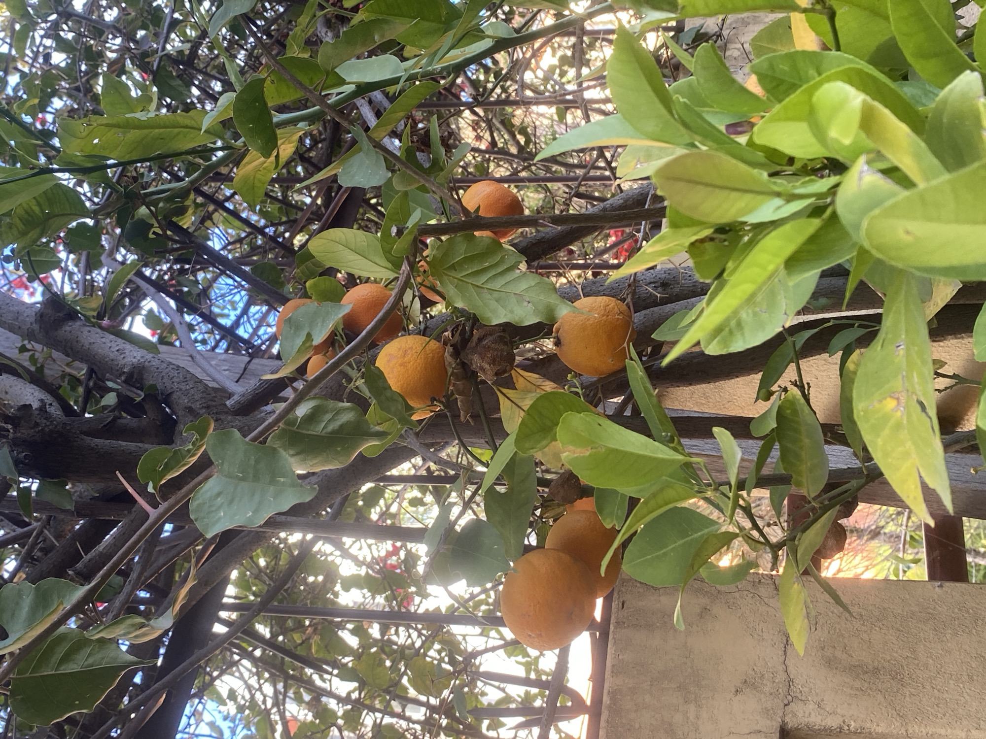 close-up view of an orange tree growing on a wooden pergola, possibly in La Paz, Bolivia, though location is not discernible from the image