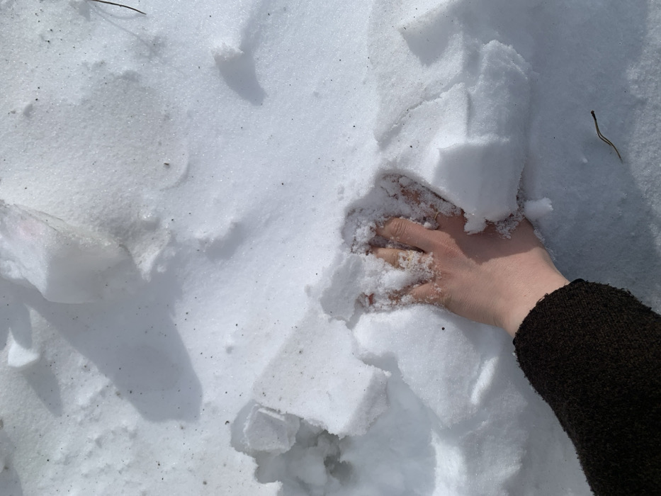 A light-skinned human hand, wearing no glove, is depicted from the wrist down, pressed into a field of white snow