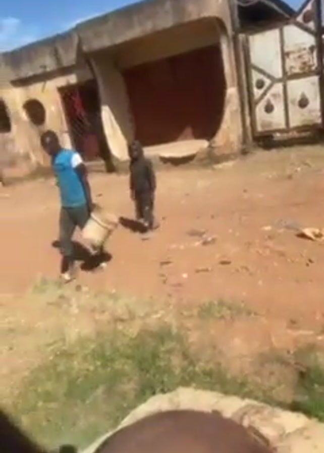 two people in a sunlit, rural setting. The environment consists of weathered buildings with closed storefronts, a dirt road, and patches of grass. Debris is scattered on the ground. One person, a man wearing a blue and white shirt and jeans, carries a white bucket. A child, dressed in a dark hooded sweatshirt and shorts, stands near him. The man walks in one direction while the child adjusts the hood of their sweatshirt, seemingly watching the man.