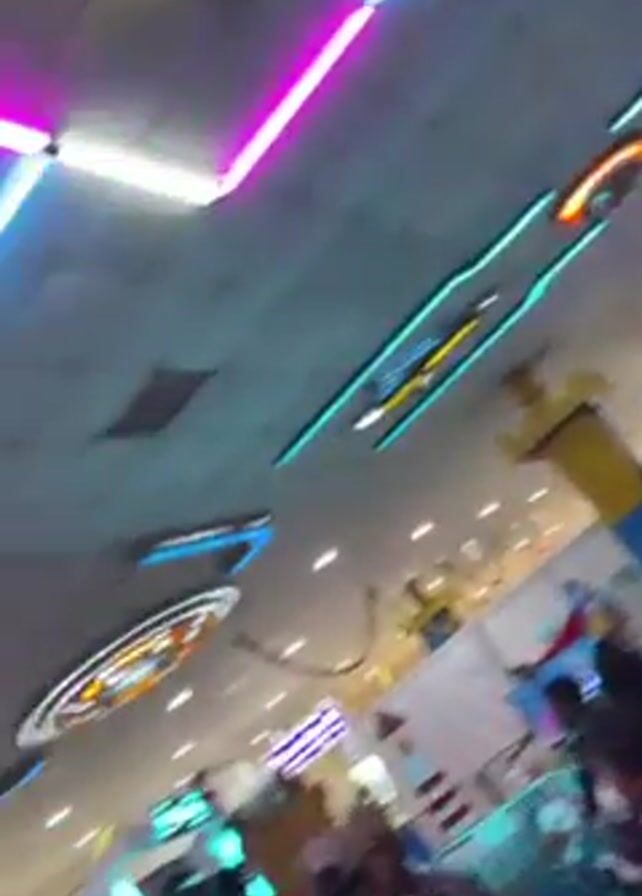 The video pans across a colorful arcade, highlighting the neon lighting and various game machines