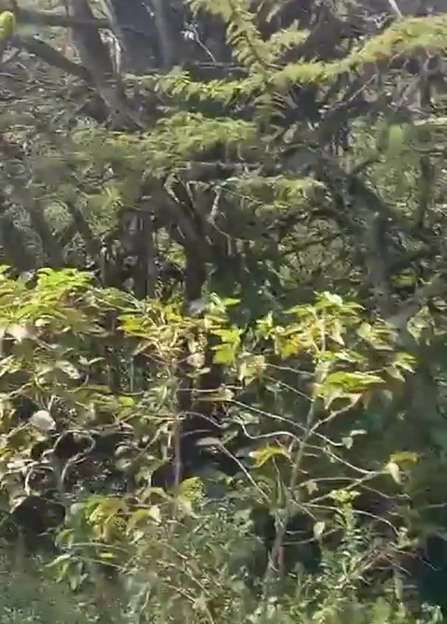 view of a lush, green landscape, possibly a forest or park. The camera pans upwards, revealing a mix of dense foliage, trees, and a clear sky. The foreground is filled with shrubs and grassy areas, while the background shows taller trees and a more open grassy area. The branches of the trees are intertwining, creating a dense canopy. The lighting suggests it is daytime.