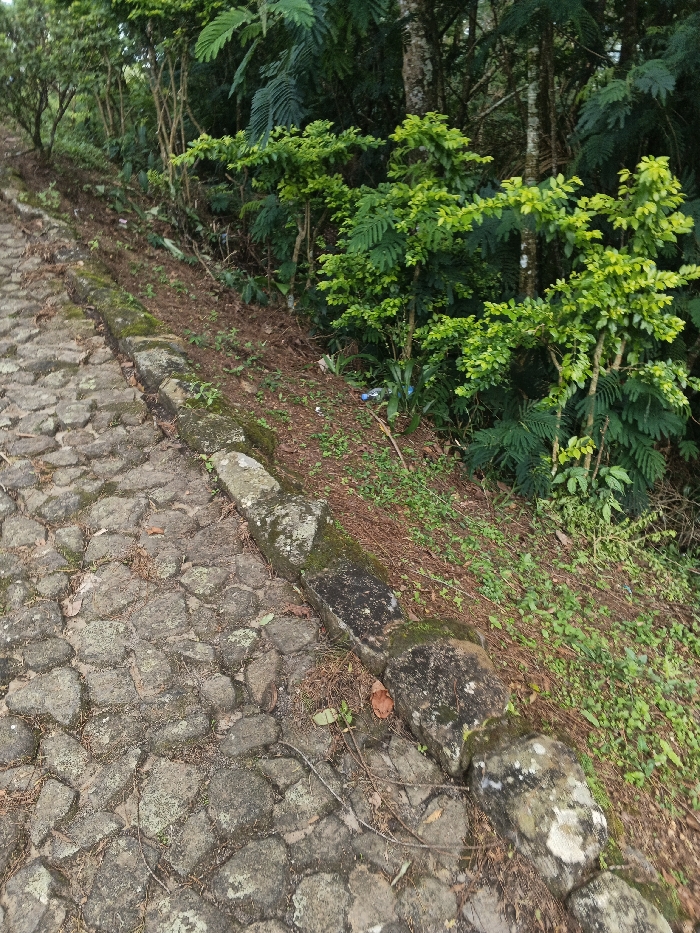 A winding cobblestone path bordered by a moss-covered stone curb. Beyond the curb, a slope covered in pine needles and small plants transitions into dense foliage. Small trees with vibrant green leaves intermingle with taller, darker trees. A discarded plastic bottle rests among the vegetation. The scene evokes a natural, slightly unkempt environment.