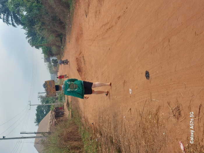 A person walks down a dirt road, carrying something square and flat on their head. The individual wears a green patterned shirt and dark shorts. The road stretches into the distance, where other people and a motorbike can be seen. Trees line the road on both sides. A sandal lies on the ground. Trash litters the roadside. Overhead power lines run along the left side of the road.