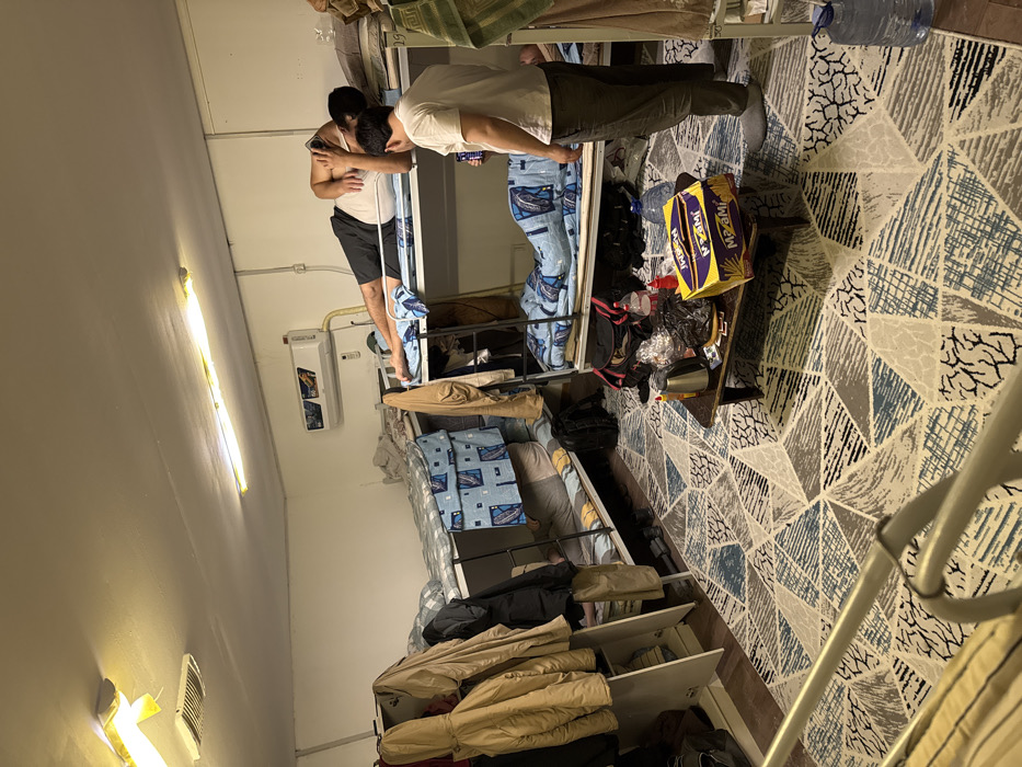 A crowded dorm room contains stacked bunk beds with storage beneath. Two men are visible: one stands on the top bunk in a white shirt and black shorts, embracing another man standing on the floor in a white shirt and gray pants. Personal belongings, bags, and a box are clustered near the beds. An air conditioning unit is mounted on the wall. The floor is covered with a geometric pattern rug.