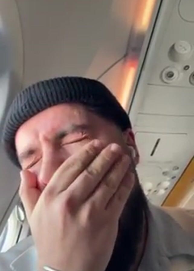 man wearing a black beanie, a light-colored jacket, and what appears to be a bracelet on his left wrist, possibly on an airplane. He is rubbing his face and eyes with his hand. His expression suggests he might be experiencing discomfort or emotional distress. The interior of the airplane is visible in the background, including the overhead compartment and air vents. The lighting is warm, possibly due to the cabin lights.