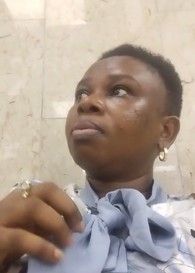 A woman is facing upwards with her head tilted to the left, then she looks forward. She has short hair and is wearing a light-colored patterned shirt with a blue tie. She has gold hoop earrings and a gold ring with a stone. She is indoors with a textured light-colored wall behind her. There are indistinct background sounds.