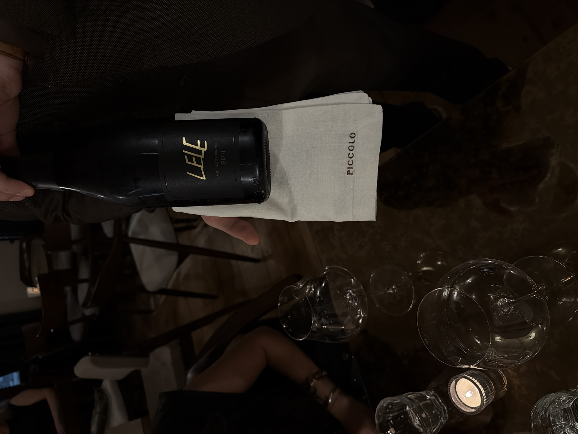 black bottle of "LELE Brut" champagne being held by a person in a dark gray jacket. The bottle is wrapped in a white "PICCOLO" cloth. A table with several empty wine glasses and a lit candle is visible below. The location is Yerevan, Armenia. A person wearing multiple silver bracelets is sitting at the table.