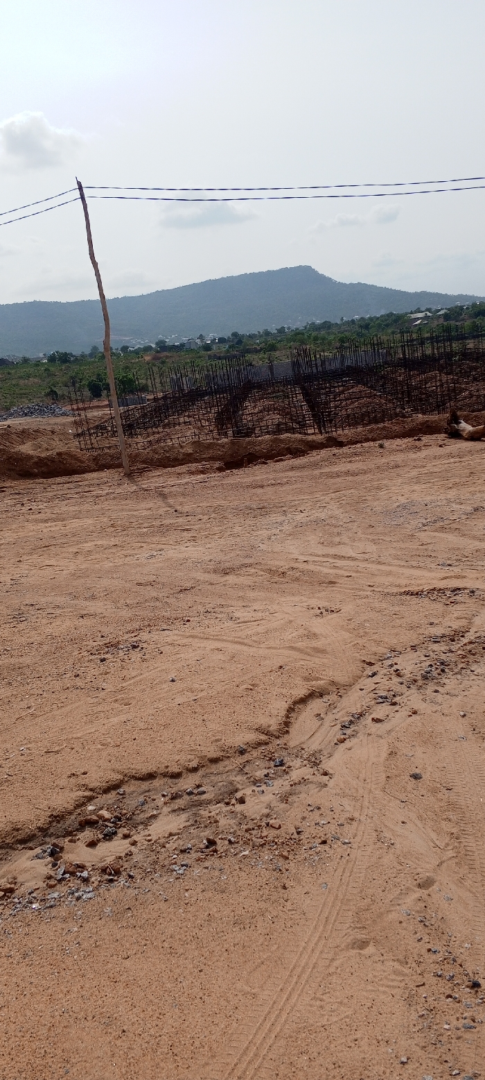 The image depicts an outdoor construction site within a rugged, semi-urban landscape in Unknown, Unknown, under a bright, hazy sky with sparse clouds. The foreground consists of reddish-brown dirt earth, marked with vehicle tire tracks and scattered small rocks. A shallow, irregular depression runs across the mid-foreground. In the midground, several dark metal rebar structures, arranged in large arch-like or square forms, indicate ongoing construction, possibly for a foundation or retaining wall. To the left of these structures, a pile of grey rocks is visible. A tall, slender wooden utility pole stands vertically on the left, supporting two horizontal power lines that cross the upper midground. To the far right, near the rebar, a light-colored animal, possibly a dog, lies on the dirt. The background features a range of green, tree-covered mountains, below which scattered buildings and structures of a settlement are discernible. No human figures are visible. The lighting suggests daylight conditions, likely midday.
