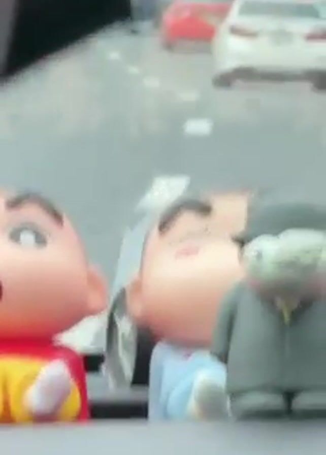 dashboard of a car in motion, with a collection of small Crayon Shin-chan character figurines lined up