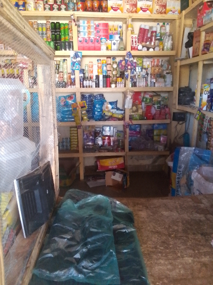 The interior shows a small, rustic shop. Shelves display assorted groceries, personal care items, and canned goods. Bags of rice are stacked on the floor, alongside wrapped goods. A mesh structure and a TV monitor rest on the left, while the floor is rough. Overall, the scene is cluttered, hinting at a family-run business.