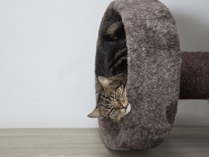 - "An adult tabby cat, displaying brown and black striped fur, is seen sleeping within a round, elevated, plush taupe-brown cat bed" by FM-MASx12, licensed under CC BY 4.0