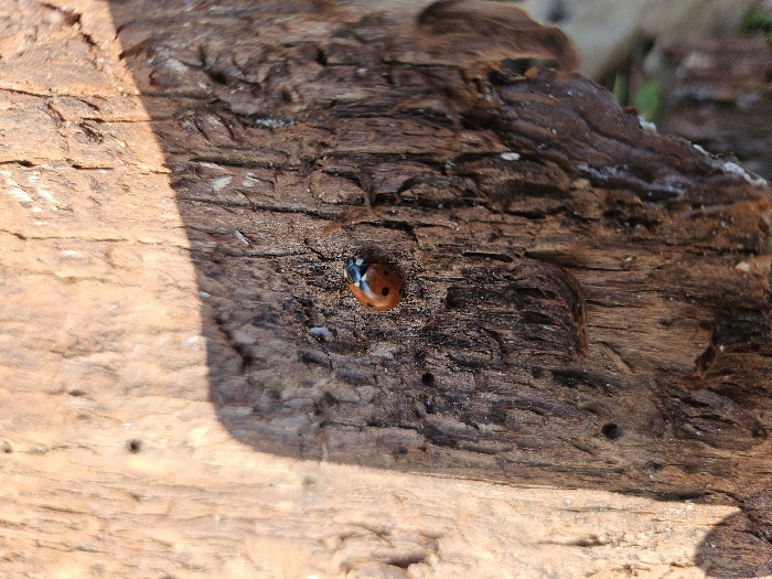 - "An overhead close-up image captures a single ladybug (Coccinellidae) situated on a textured, weathered wooden surface, likely a tree trunk or log, in Varna, Bulgaria" by FM-l2gGi1, licensed under CC BY 4.0