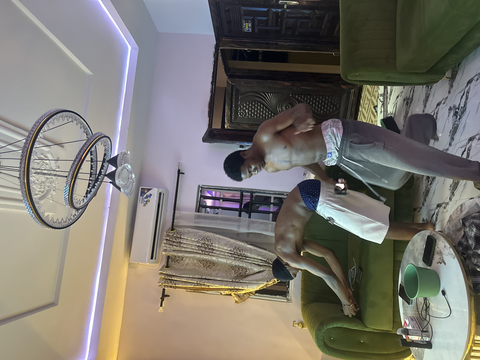 Two shirtless men stand near a green velvet sofa. One, facing forward, wears grey sweatpants. The other, facing away, wears white shorts with blue polka dots and a black head covering. A round table with a green pot sits beside the sofa. A window with decorative curtains is visible behind them. An air conditioning unit is mounted on the wall. A modern chandelier hangs from the ceiling. A large, ornate dark wood cabinet is in the background. The floor is a light-colored marble.