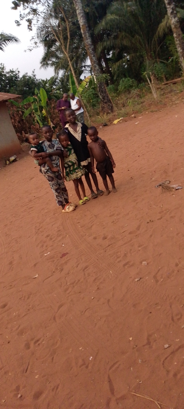 A group of five children stands together in a dirt area. They vary in age and dress. The youngest child is being held. Trees and vegetation surround them. Two adults stand in the background. The ground is reddish-brown, with tire tracks visible. The sky appears overcast. A dilapidated structure stands to the left.