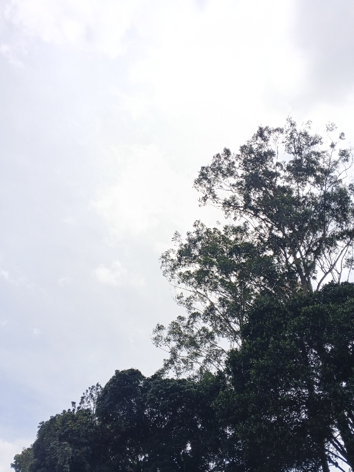 The image displays an upward perspective of a sky and tree canopies. The sky occupies approximately two-thirds of the frame, appearing light gray to white with diffused cloud formations. The lower right and bottom portions of the image are filled with dense, dark green foliage from multiple tree canopies. Lighter branches with sparser leaves are visible against the sky in the upper right quadrant, suggesting a substantial tree structure. No individuals, artificial structures, or ground features are present. The scene is located in Palayan, Philippines.