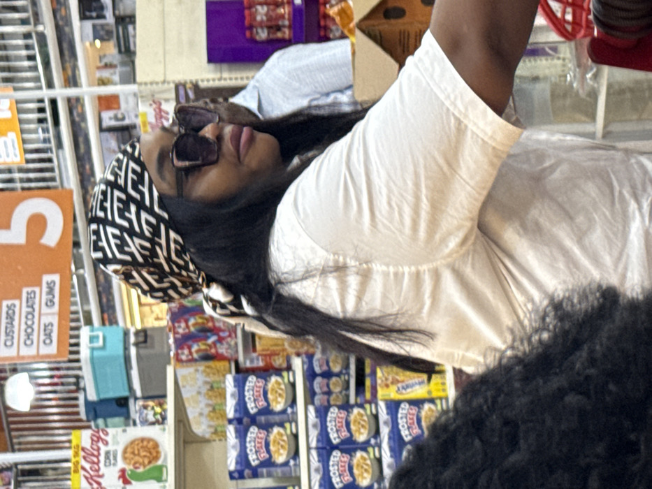 This image depicts an indoor scene within a supermarket, identified as being located in Ado, Nigeria. In the mid-ground, a woman is captured in a profile view, facing towards the viewer's left. She wears a light-colored, short-sleeved top and a black and white patterned headscarf, possibly featuring a repeating logo design. Her long, dark hair extends over her shoulders. Large, dark-framed sunglasses obscure her eyes, and her lips appear to have a pink hue. Her left arm is partially visible on the right side of the frame. To the woman's immediate left, the top of another person's head with dark, curly hair is visible in the lower-left corner. Behind the main subject, on the right, a man's light blue collared shirt and part of his face are visible. The background reveals typical supermarket shelving units stocked with various consumer goods. Prominently displayed on multiple shelves to the left are numerous blue boxes of "Frosted Flakes" cereal. Higher up and to the far left, a yellow "Kellogg's Corn Flakes" box with a rooster logo is visible. Several light blue and gray coolers are stacked on a shelf in the upper left background. On the far right, red bottles are arranged on a purple display stand. Overhead, an orange sign features white text listing "CUSTARDS," "CHOCOLATES," "OATS," and "GUMS." Adjacent to this, a large white number "5" is displayed on an orange background. Overhead lighting fixtures are present. In the lower right, a brown cardboard box with an open top is visible, partially obscuring a red object, possibly a basket.