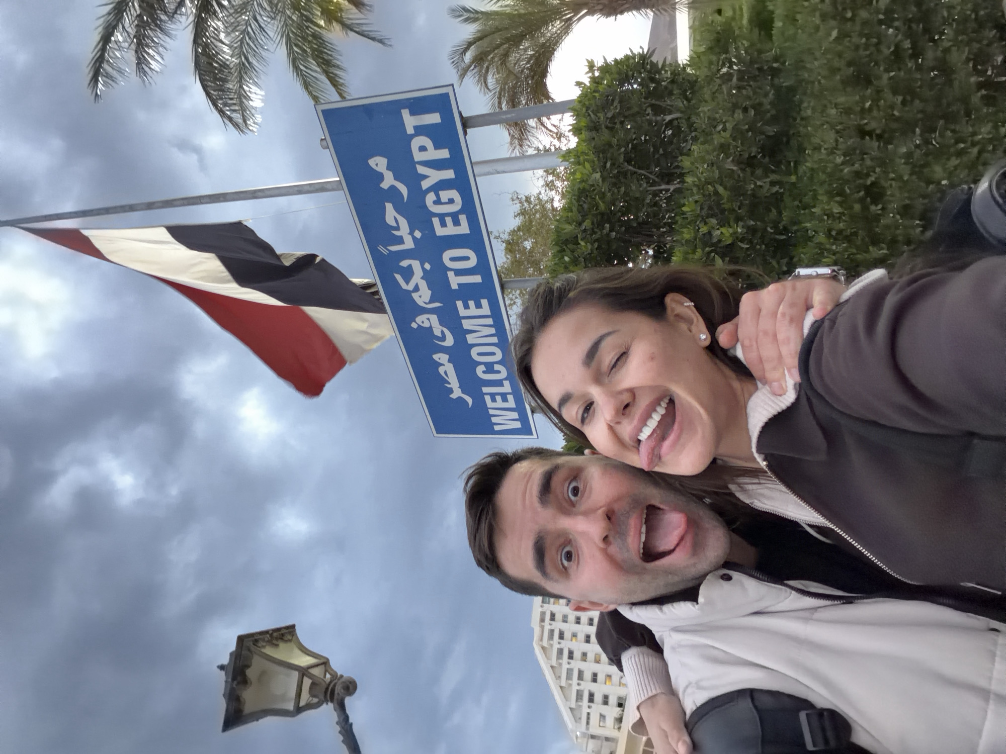 A selfie-style photograph depicts a male and female subject posing at an entry point in the city of Taba, Egypt