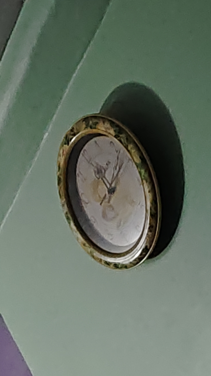 This scene takes place in Jaipur, India. A circular wall clock is mounted on a muted green surface. The clock features a gold-colored bezel with an embossed decorative pattern and a light-colored face displaying dark hour and minute hands, indicating approximately 9:10. The clock casts a distinct, dark, crescent-shaped shadow to its right, suggesting a light source from the left. A blurry, purple-hued element is visible in the lower-left corner of the frame. No individuals, actions, or interactions are depicted within the scene.