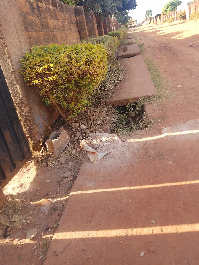 This image depicts an outdoor scene in the city of Unknown, Unknown. The foreground features an unpaved, reddish-brown dirt road. To the left, a concrete block wall runs parallel to the road, with a vibrant green, densely leaved shrub positioned against it. At the base of the shrub, between the wall and the road, is an accumulation of debris, including several loose stones, a broken concrete block, and a crumpled white plastic bag containing light-colored material, possibly dirt or construction refuse. Adjacent to the road and the wall is a partially covered drainage ditch or culvert, indicated by several flat concrete slabs. One slab in the immediate foreground has an open section revealing sparse green vegetation growing within the ditch. Further down the road, additional concrete slabs cover the ditch. The road surface itself is dry and dusty, with distinct parallel shadows cast across it from an unseen overhead source, extending from the left side towards the right. In the background, the unpaved road continues into the distance, flanked by sparse vegetation and a line of structures, possibly residential buildings, under clear daylight conditions. No individuals are present in the scene.