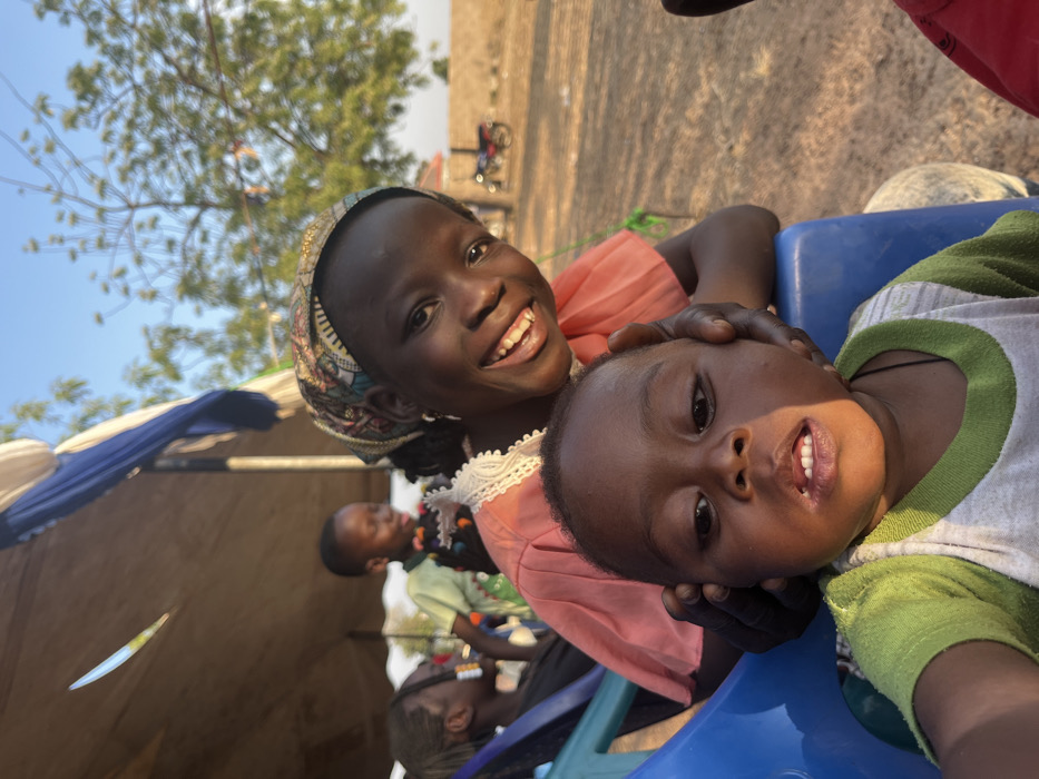 Two children with dark complexions are prominently featured in the foreground. An older child, identified as female, smiles widely at the viewer while her hands gently cup the sides of a younger child's head. She wears a colorful patterned headscarf, a coral-colored top with white lace trim, and small earrings. The younger child, a male toddler, sits in a blue plastic chair, looking directly forward with a neutral expression, wearing a green and white long-sleeved shirt. Sunlight casts a distinct shadow on the left side of his face. In the mid-ground, under a canopy structure made of white and blue fabric, several other children are visible. One child, partially obscured, wears a dark top, and another wears a light green shirt with a colorful beaded accessory. The background reveals an outdoor setting with dry, light brown ground under a clear blue sky. Sparse trees, a low light-brown wall, and a dark motorcycle are visible in the distance. The lighting suggests either early morning or late afternoon. Location: Unknown, Nigeria.
