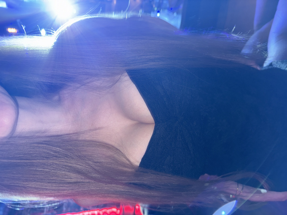 The image displays a close-up, mid-torso to upper-chest view of an individual, likely female, against a heavily blurred and artificially lit background. The location as Tsakhkadzor, Armenia, cannot be determined from the visual content. The individual has long, straight, light brown or auburn hair flowing down both shoulders and arms. They are wearing a dark, possibly black, strapless top or dress with a subtle texture on the fabric, and prominent cleavage is visible. The chin and lower lip are partially visible at the top edge, suggesting a slight smile. The individual's left arm, visible on the lower left, has light skin, white-painted fingernails, and multiple thin, gold-colored bracelets. On the lower right, another light-skinned hand or arm, possibly belonging to the same individual or another person, is visible, resting on or near a light-colored, textured fabric, potentially lace. The background features vertical red light elements on the left and a very bright, diffused blue-white light source on the right, creating a prominent lens flare and illuminating the subject's hair and right side. The overall environment appears to be an indoor setting with colored ambient lighting, characteristic of a bar or club. The subject is positioned facing the camera.