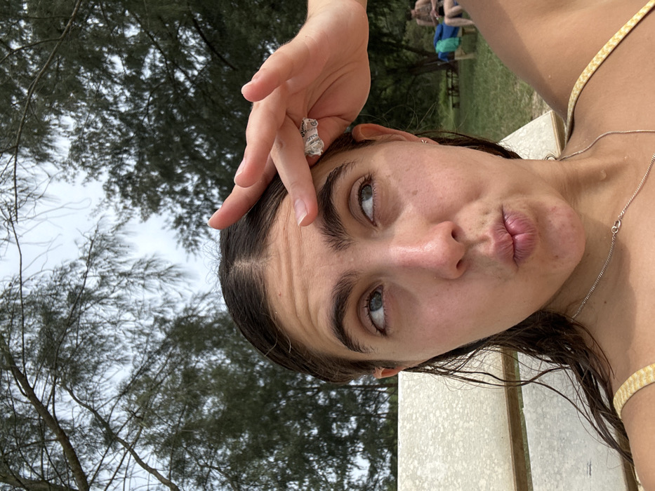 A woman with light skin, pouty lips, and light eyes gazes upwards with a hand on her forehead. A large ring is visible on her finger. She has wet, dark hair, a silver necklace, and a yellow-and-white patterned bikini strap. In the background are trees and greenery with other people partially visible sitting on a bench. The overall shot is an angled close-up, possibly a selfie, taken outdoors on a cloudy day.