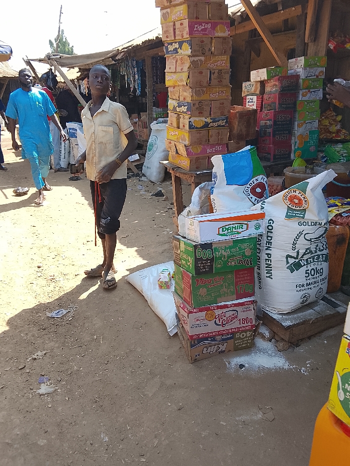 A young person stands next to a stack of goods at an outdoor market. Boxes of "ZigZag," "Festo," "Dahir," "Viva Plus," and "Top Clean" are stacked high, alongside bags of "Golden Penny" wheat flour. Other boxes and bags of goods are visible in the background, along with market stalls and people. The ground is dusty, and the scene is brightly lit. The items suggest a focus on food and household products.