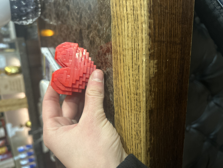 The scene depicts a close-up view within a commercial establishment, likely a bar or cafe, located in the city of Silistra, Bulgaria. A fair-skinned adult's right hand, with short, clean fingernails, holds a red, heart-shaped object constructed from numerous small, interlocking plastic blocks. The hand grips the lower portion of the heart with the thumb and index finger. The object and hand are positioned above a dark brown, possibly mottled stone or laminate countertop. In the foreground, a polished wooden bar counter edge, featuring a lighter oak-colored top and a darker stained apron, is prominent. Below the counter, a section of dark, possibly leather, tufted upholstery is visible. The background, out of focus, reveals shelves stocked with various bottles and containers, including blue and reddish items, alongside metallic or golden decorative objects and a subtle warm light source.