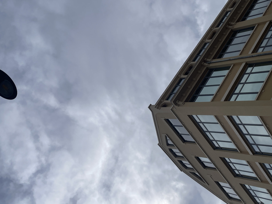 The image displays the upper section of a multi-story building in Villeurbanne, France, viewed from a low-angle perspective. The building features a light brown facade with multiple rows of large, rectangular windows set in dark frames, reflecting a grey, cloudy sky. The left side of the structure terminates in a sharply angled roofline, containing several smaller, multi-pane windows within the attic space. The right side of the building presents a flatter roofline, beneath which a row of smaller, rectangular windows is visible, topped by a decorative cornice. A dark, vertical downspout is affixed to the right exterior wall. A dark, circular street light fixture is partially visible in the upper center of the frame, silhouetted against the uniformly overcast and cloudy sky. No individuals or discernible activities are present.