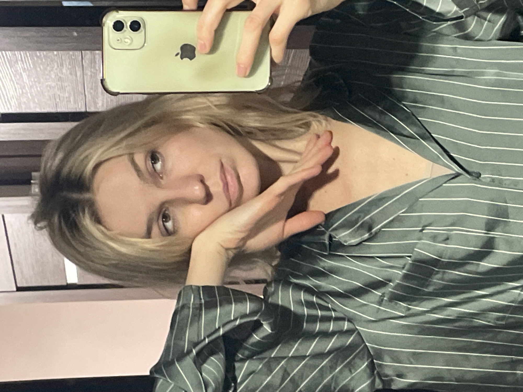 The image captures a mirror selfie of a fair-skinned female indoors. The subject, with shoulder-length blonde hair and a neutral expression, looks slightly to her right. She wears a dark greenish-grey satin-like shirt or pajama top with thin white vertical stripes. Her left hand is positioned with fingers spread, resting against her jawline and upper chest. Her right hand holds a light green iPhone with a clear case, reflecting in the mirror and obscuring part of the subject's face. The phone displays a dual-camera system and an Apple logo. The background shows a segment of a light pink wall on the left and a dark wooden panel with vertical graining on the right. No discernible visual information indicates a specific location within Moscow, Russia.