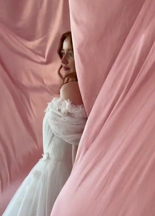 A woman in a white formal dress stands beside a pink curtain. The woman has red hair and fair skin. She is looking to her left, then raises her right hand and looks at it before touching the pink curtain with her fingertips. The curtain drapes in loose folds.