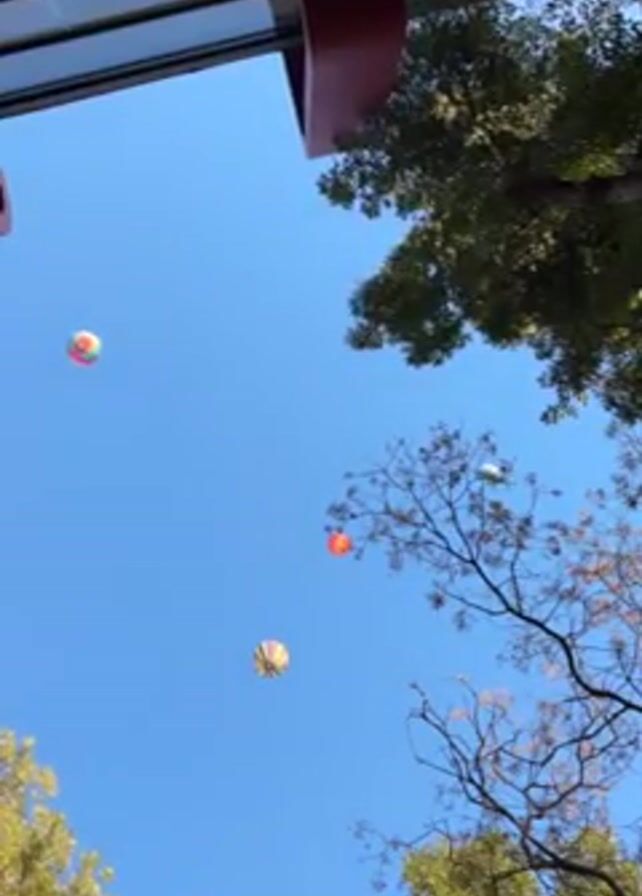 From a low angle under a red overhang with a partial glass roof, a clear blue sky is dotted with several colorful hot air balloons. Green trees frame the scene, some with leaves and others bare-branched. The balloons appear to be floating leisurely. The setting is a bright, sunny day.